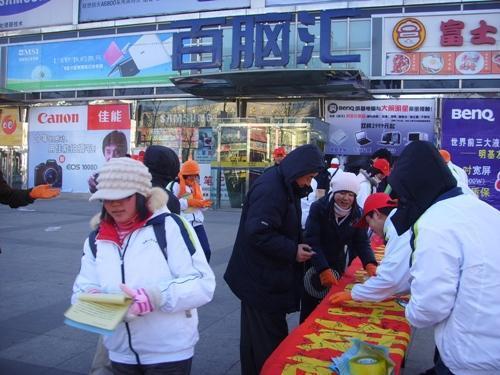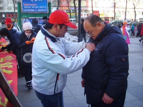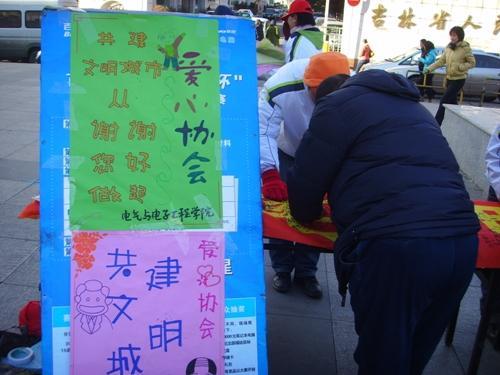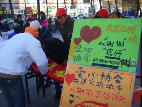 爱心志愿者协会携手百脑汇在百脑汇商场门前举行了“共建文明城市,从谢谢您好做起”大型签名活动。 活动现场虽然天气寒冷但却温情洋溢,和谐美好。志愿者们礼貌热情地发放印有建设文明城市倡议书的宣传单,送出爱心结并邀请市民朋友签名。市民朋友们也积极配合,在寒风中仍然热情的在条幅上郑重的签下自己的名字。接到爱心结的市民都露出真诚的微笑,爱心结虽小却饱含了志愿者深深的祝福和对共建文明城市殷切的希望。 这次活动不仅让同学们实现了自己的价值,而且为同学们提供了社会实践的机会。同学们表示为建设繁荣、和谐、文明、美丽的第二故乡长春贡献出自己的一份力量。
