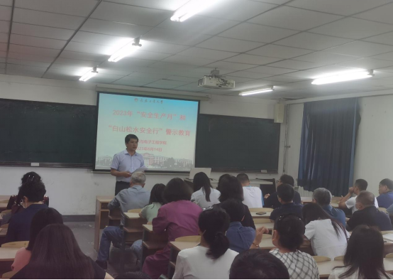 首先,由学院党委书记按照上级指示精神落实《关于开展2023年“安全生产月”和 “白山松水安全行”活动的通知》有关要求进行传达,警示全院教职员工要确保安全第一,预防为主,持续树牢安全红线意识,推动安全生产责任落实,切实提高风险隐患排查整改质量,切实提升发现问题和解决问题的能力和水平,进一步提升全院师生安全意识和避险逃生能力。