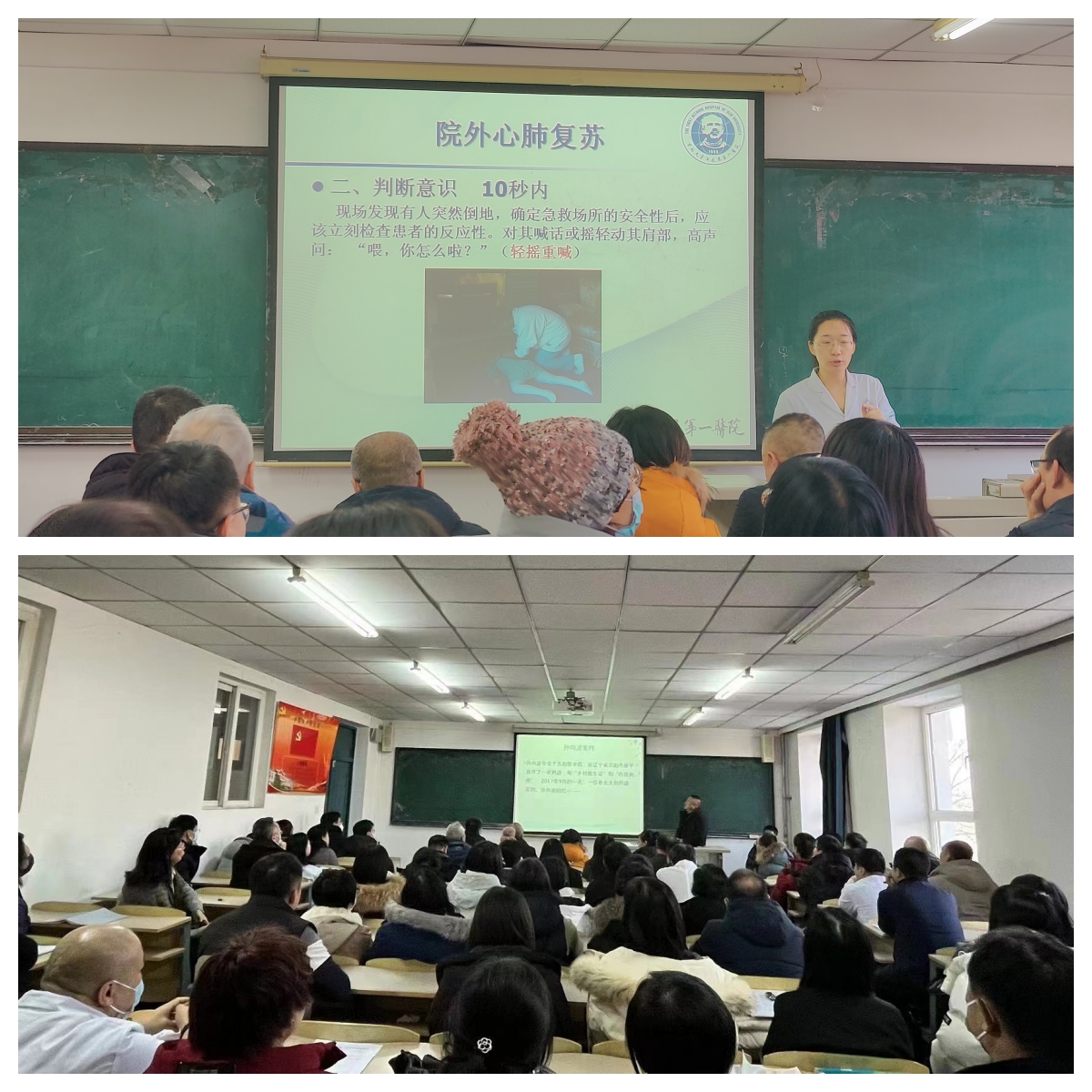 接着刘海波主任致辞,对此次受邀宣讲表示非常荣幸,同时结合多年急诊经历,列举了几个在校园内发生的急性猝死案件,让大家了解到高校师生掌握基本急救知识的重要性和必要性,同时呼吁大家能把学到的知识传递给更多的人,共建院前急救社会系统,提高患者救治的成功率。刘斌副主任医师以《说说和急救相关的那点事》为题,以一个个案件为导,用幽默诙谐、简单易懂的语言向大家介绍了心肺复苏、触电和溺水的急救方式和注意事项,为大家建立了一定的理论基础。