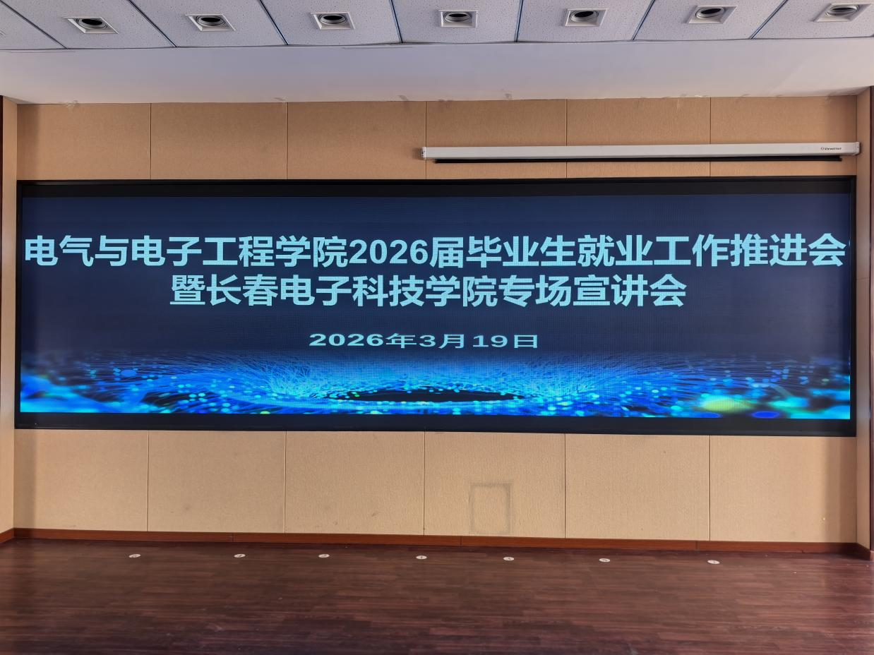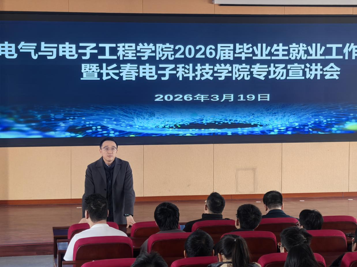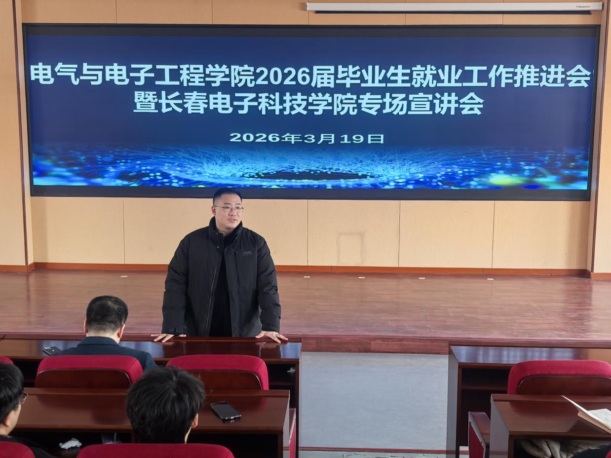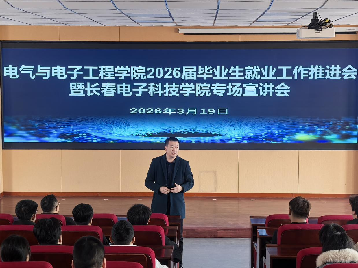 在综合楼三楼召开2026届毕业生就业工作推进会暨长春电子科技学院专场宣讲会。学院党委书记徐建伟、院长董博、党委副书记谷阔、毕业班导员及全体2026届毕业生参加会议。